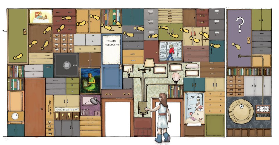 Sketch of the Nancy Drew Mystery Wall. Clues are gathered by completing activities on the wall including iSpy vitrine, magnifying panel and UV light clues. There is a decoder on the last panel which gives the password to look into the secret hideout.